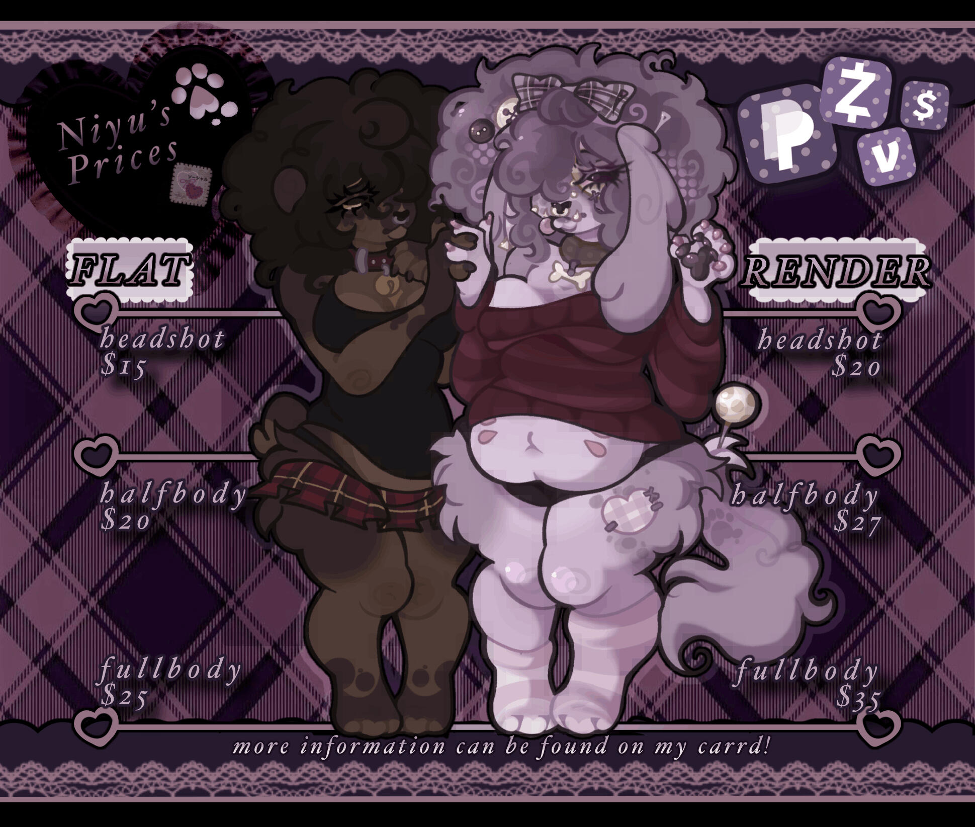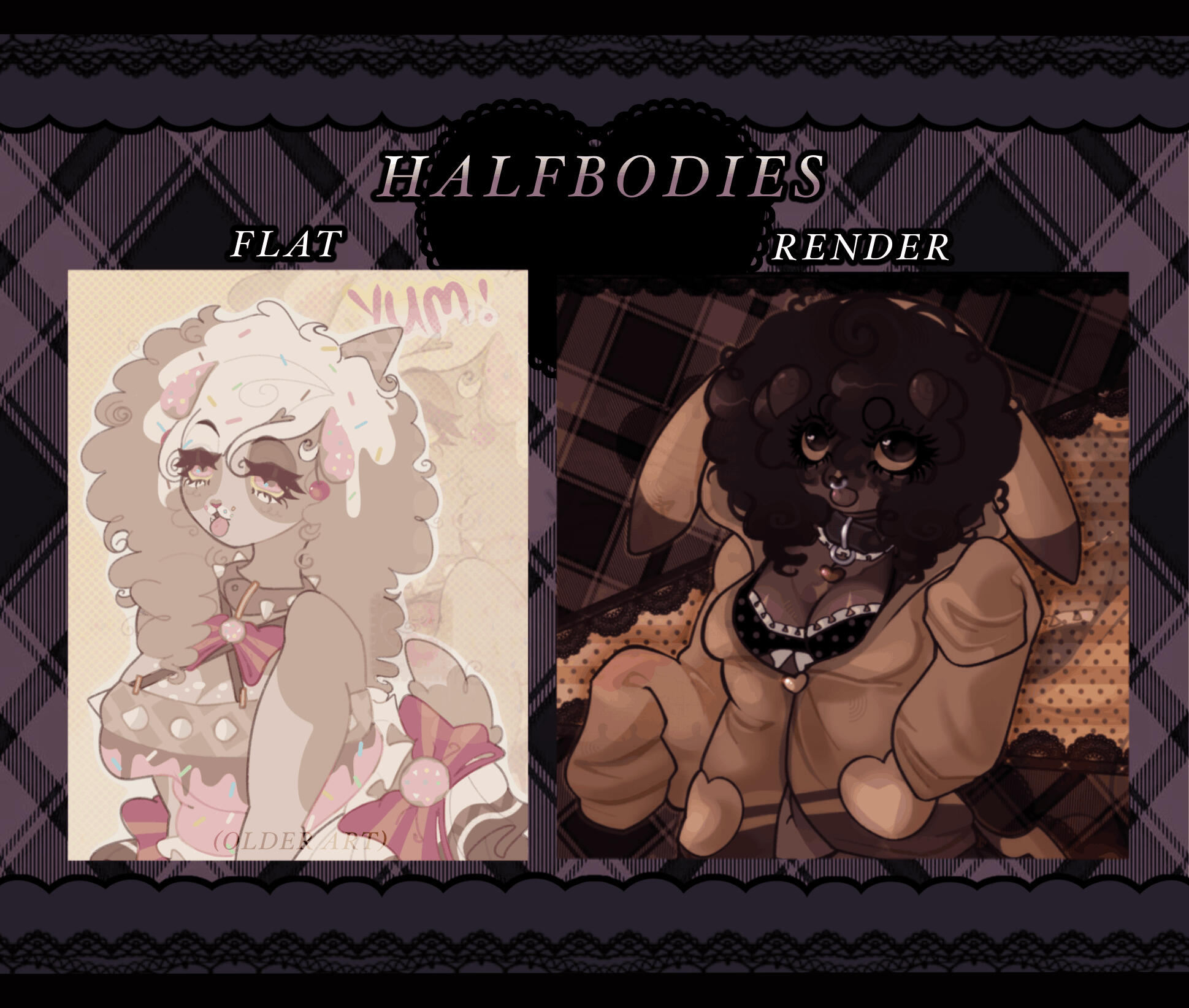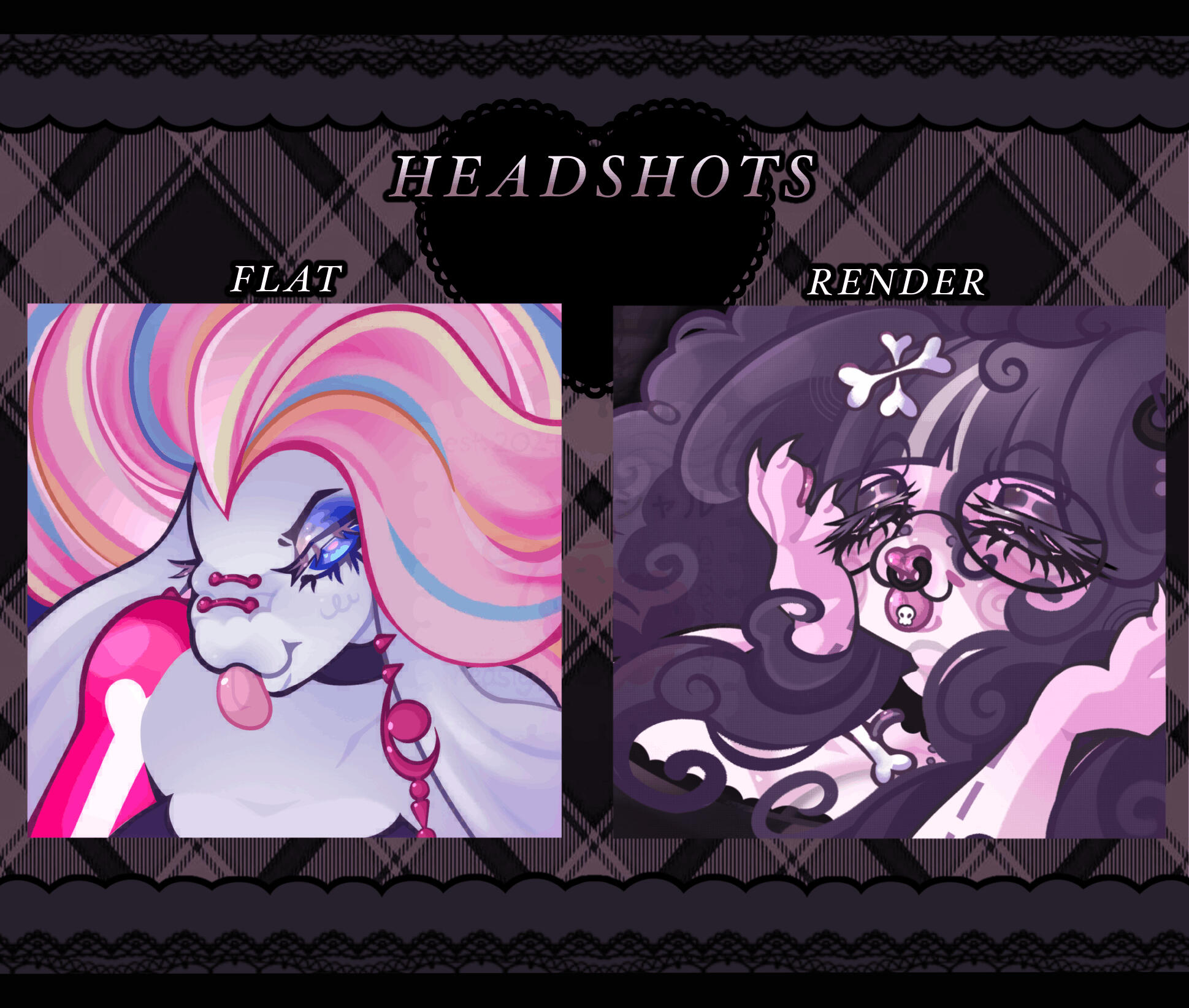 all services are base prices and start w/ lineart, flat color / minimal shading, & simple bg.ranges are dependent on complexity of what you’re wanting. (ex. rendering for headshot {$5) , halfbody {$7) , fullbody {$10} )examples are below + more can be found on my social medias, I am happy to discuss and negotiate a price for anything not listed, as well as give quotes!